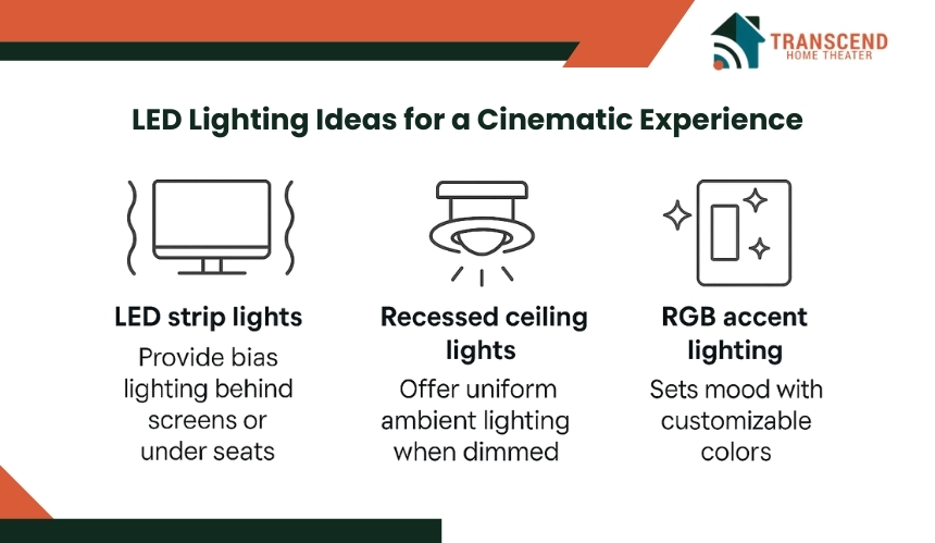LED technology offers flexible design options and precise control over brightness and color. The following LED ideas create an atmosphere that balances function with cinematic style.