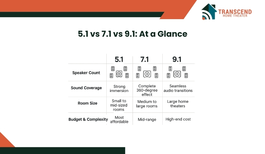 The table below highlights the main differences between 5.1, 7.1, and 9.1 speaker layouts. Each column shows how many speakers are included, what extra channels are added, and how they differ in terms of setup, budget, and room suitability.