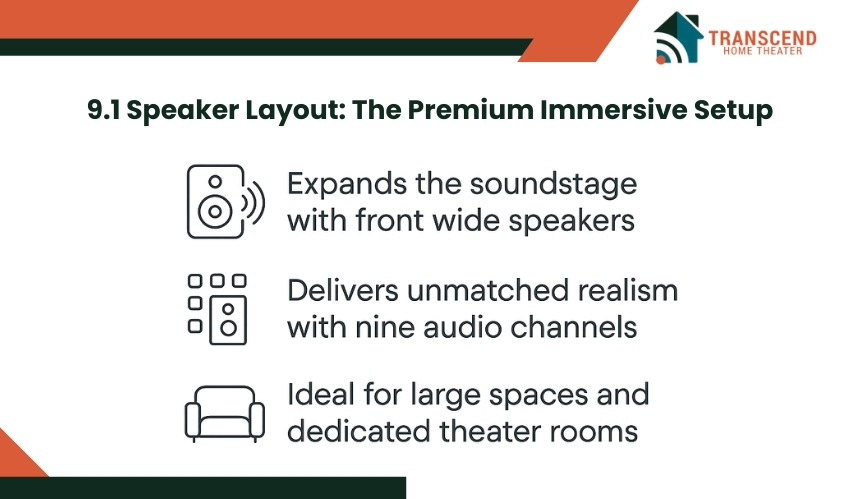 A 9.1 home theater system takes immersion to the highest level within traditional surround sound formats. It builds upon a 7.1 layout by adding front wide speakers, which bridge the gap between the front and side channels.