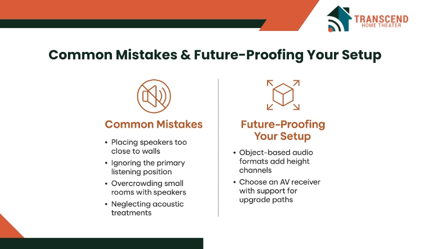 Even with the right speaker layout, poor placement can ruin the experience. Some of the most frequent mistakes include: