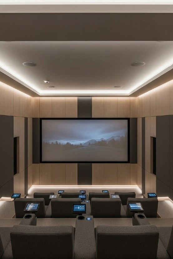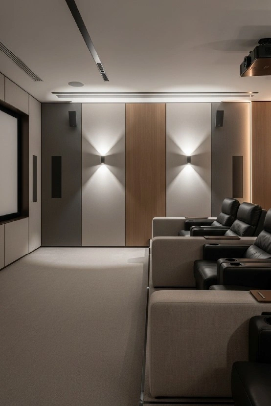 We integrate acoustic wall treatments and acoustic fabric panels that blend into modern surfaces. Combined with hidden speaker installations, this approach delivers immersive audio without visual clutter.