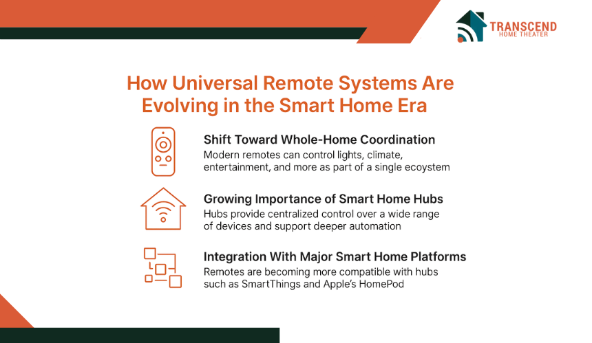 Universal remote systems are becoming more capable as they connect with larger smart home ecosystems. This integration allows users to control lighting, security, climate, and entertainment from one place while taking advantage of platform-specific features.