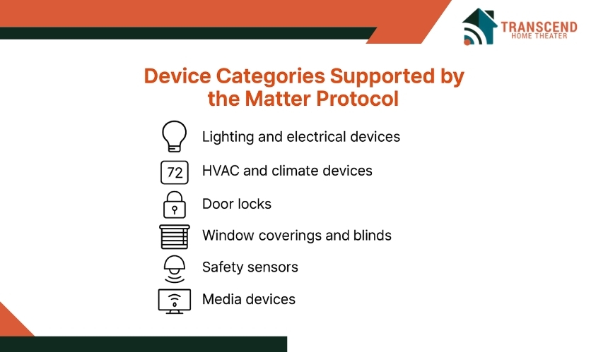 One of the main strengths of the Matter protocol lies in its ability to unify a wide range of smart home devices under one communication standard. Instead of functioning as a single-purpose system, Matter brings together almost every essential category of connected technology, allowing users to create a seamless and brand-agnostic smart home ecosystem.
