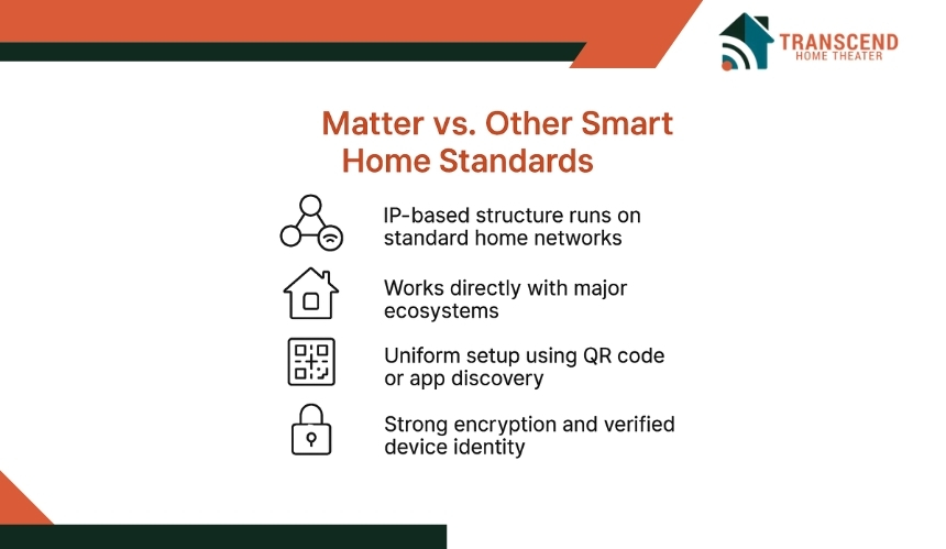 While all major smart home protocols aim to connect devices, they differ in how they manage communication, range, security, and scalability. Matter stands apart for its IP-based structure, which allows it to run directly on standard home networks without extra bridges or translators.