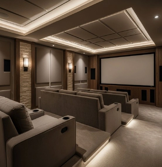 We evaluate room layout, ceiling structure, lighting conditions, and technology needs before finalizing any finishes. Whether your vision leans more rustic or more contemporary, we ensure the theater feels like a natural extension of your home’s architecture—not an add-on.