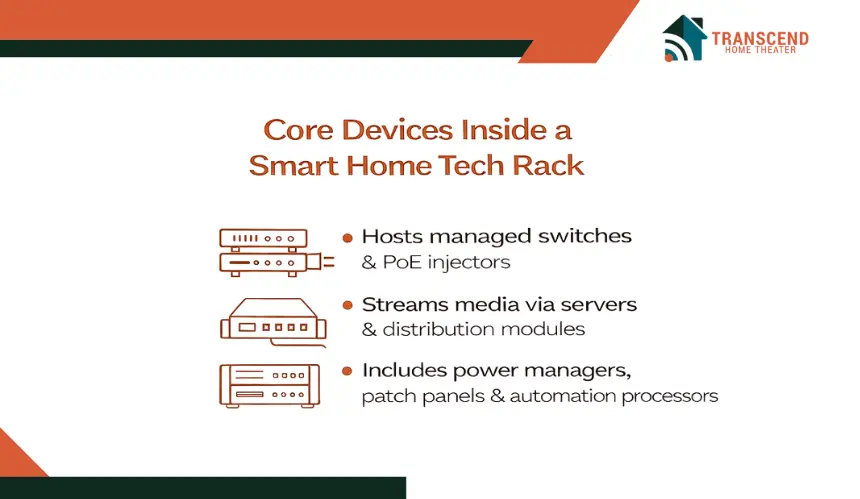 Common components include managed switches, automation processors, PoE injectors, patch panels, streaming servers, and structured wiring modules. These elements benefit from organized cable routing and consistent airflow that reduce stress on sensitive electronics.