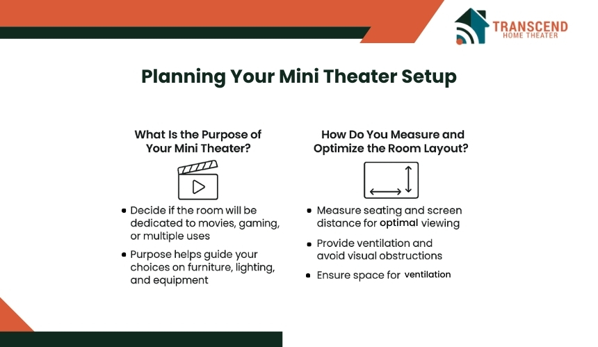 Planning is where a successful mini theater begins. Before you buy a single speaker or mount a projector, you need to align the room’s purpose, dimensions, and layout with your vision. The two main steps to plan your mini theater setup are defined below: