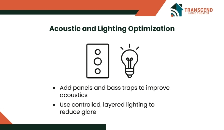 Small spaces tend to reflect sound, which can distort dialogue and bass. Adding basic acoustic treatments can significantly improve clarity and immersion.