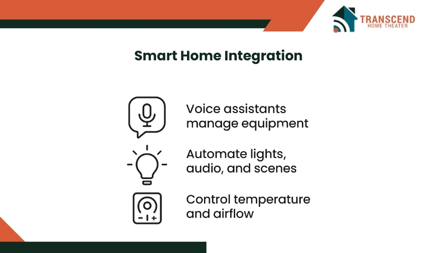 Smart technology can enhance your mini theater’s convenience, control, and immersion. Even in a small room, automation features streamline how you interact with your equipment and environment.
