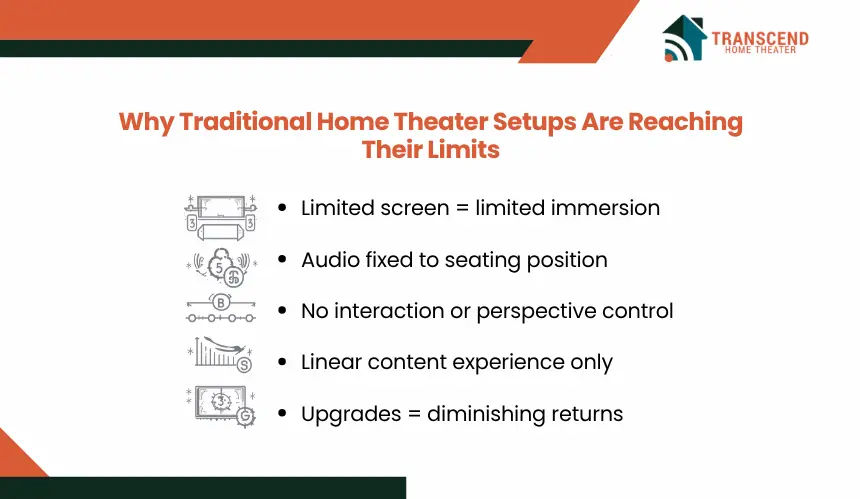 Current home theater systems deliver high resolution and powerful audio, but their architecture is still built around passive consumption. This creates structural limitations that modern immersive technologies are starting to expose.